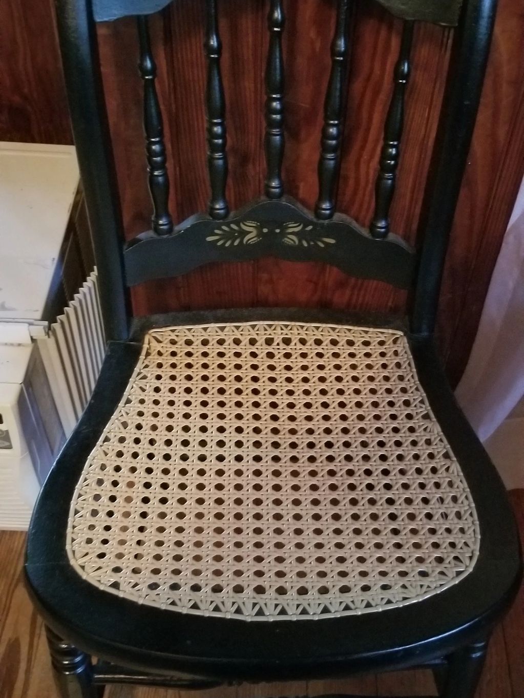 This black side chair has a traditional Lace Cane pattern set with synthetic cane.