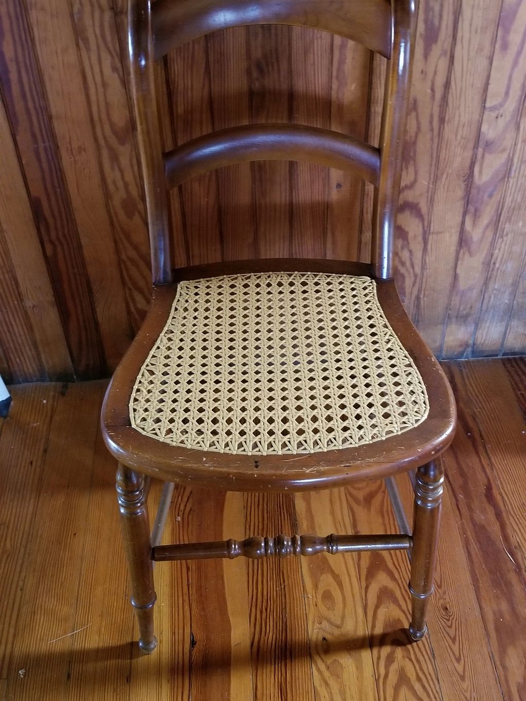 These tea-table chairs have a traditional lace cane pattern with synthetic cane.